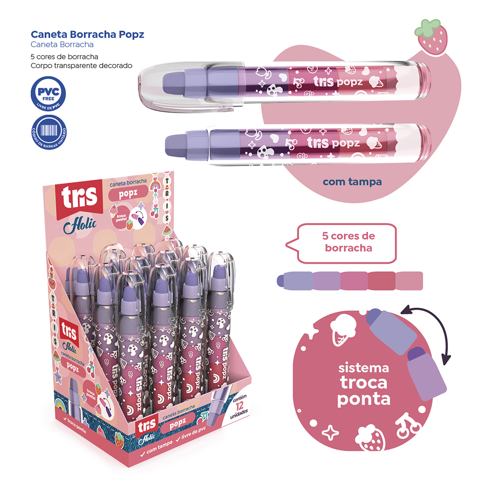 Inspirada nos pingentes e miçangas que estão em alta, a coleção Charm co nta com cores alegres e design divertido. É perfeita para customizar e c riar memórias especiais com os amigos! A caneta borracha Popz possui sis tema troca pontas, com 5 cores de borrachas! Possui tampa protetora e te m o corpo decorado!