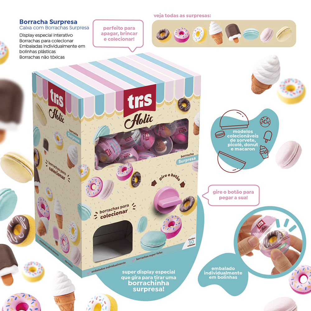 A coleção Docinho traz para as papelarias produtos inspirados nas delíci as do universo da confeitaria! Donuts, balinhas, sorvetes e muito mais! É pura fofura! A borracha Surpresa é muuuito divertida! Em super displa y espcial com botão giratório, cada borrachinha é uma surpresa! São mode los colecionáveis de sorvete, picolé, donuts e macaron, embaladas indivi dualmente em bolinhas! é perfeito para apagar, brincar e colecionar!