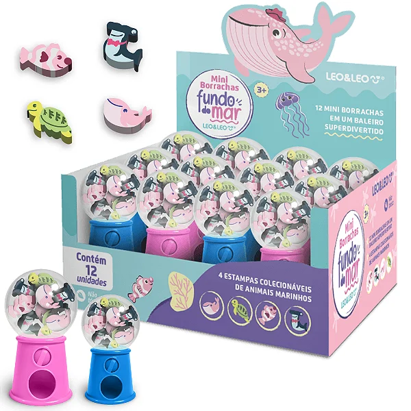 Se um baleiro de verdade já é legal, imagina um baleiro onde dentro tem lindas mini borrachas? Assim é a Mini Borracha Fundo Do Mar Pote Baleiro Com 12 Borrachas - Display Com 12 Potes Leo&Leo.