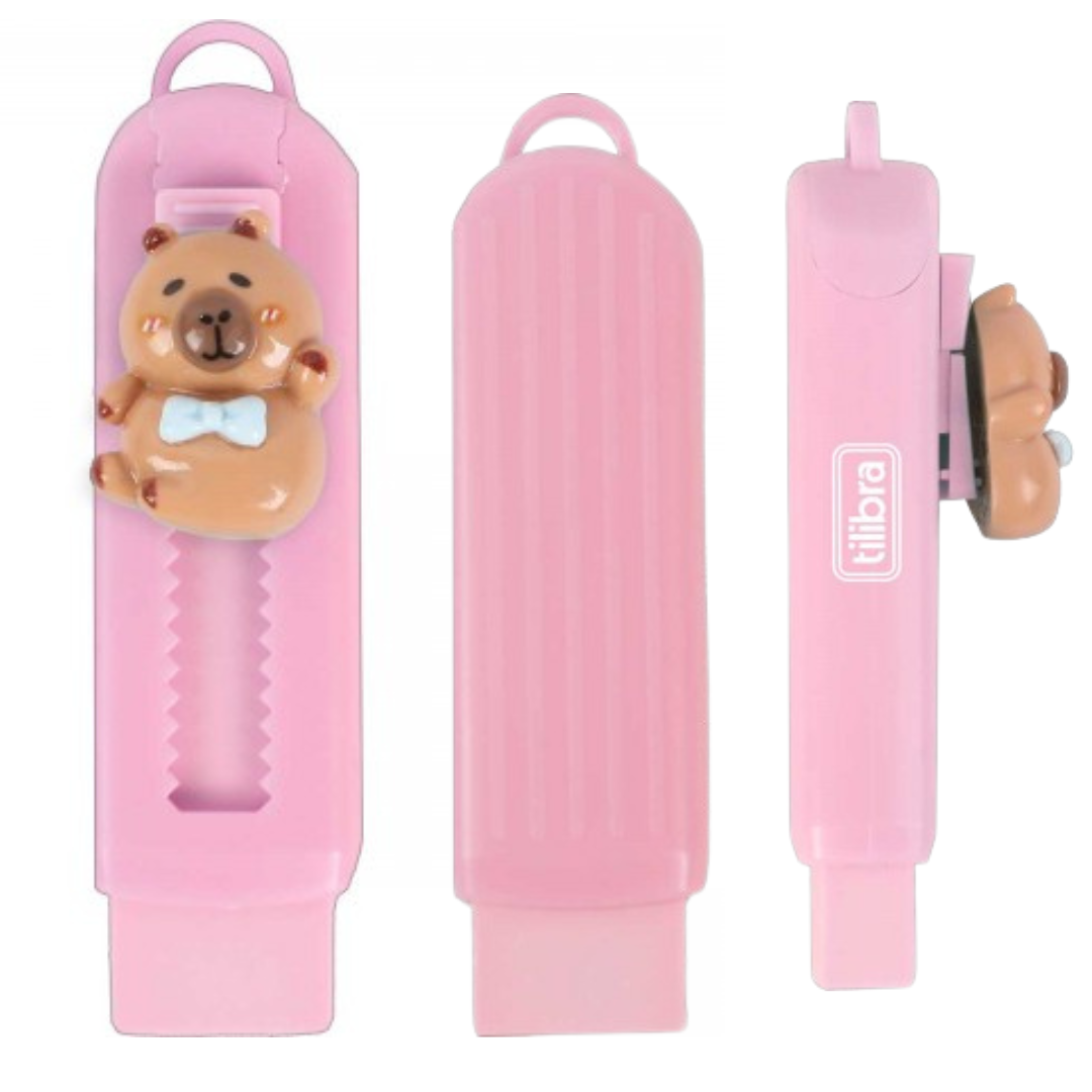 "A Borracha Retrátil CapyClub da Tilibra oferece excelente desempenho ao apagar e adiciona um charme especial aos seus materiais. O produto, certificado pelo Inmetro, é rosa e possui um botão em formato de capivara, a influencer em alta do reino animal! Feita de materiais seguros e não tóxicos, a borracha retrátil Capivara é prática para o uso diário.