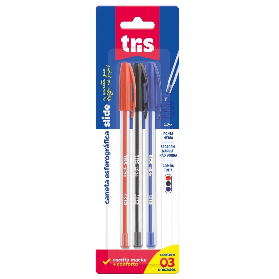 A caneta Slide é um clássico da TRIS. Ela possui ponta média 1.0mm, tampa ventilada, secagem rápida que não borra e uma escrita super macia! Cartela nas três cores clássicas: azul, preto e vermelho.