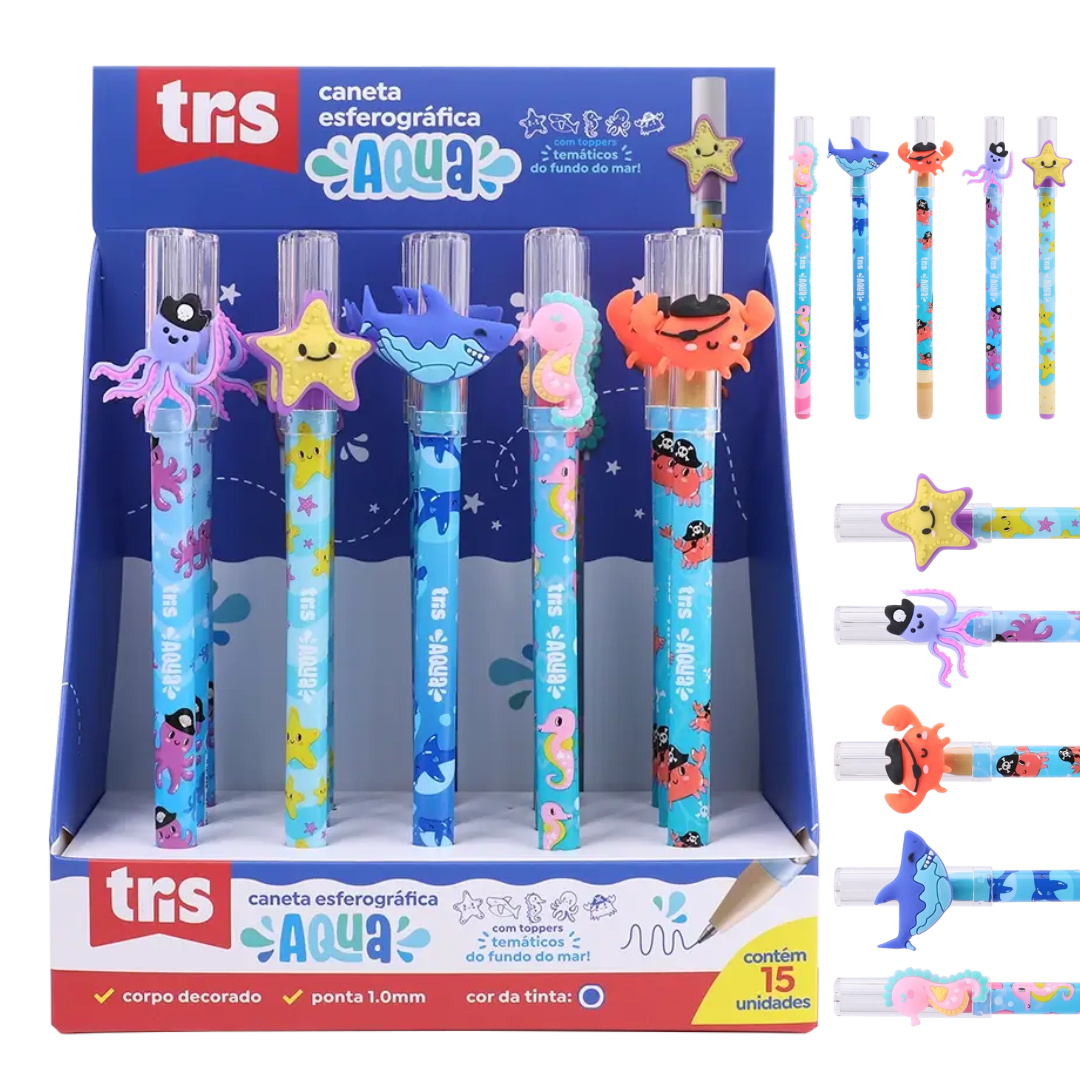 A caneta esferográfica Tris Aqua possui toppers temáticos, inspirados no fundo do mar! Sua ponta é média, 1.0mm e seu corpo é estampado. Tinta azul!