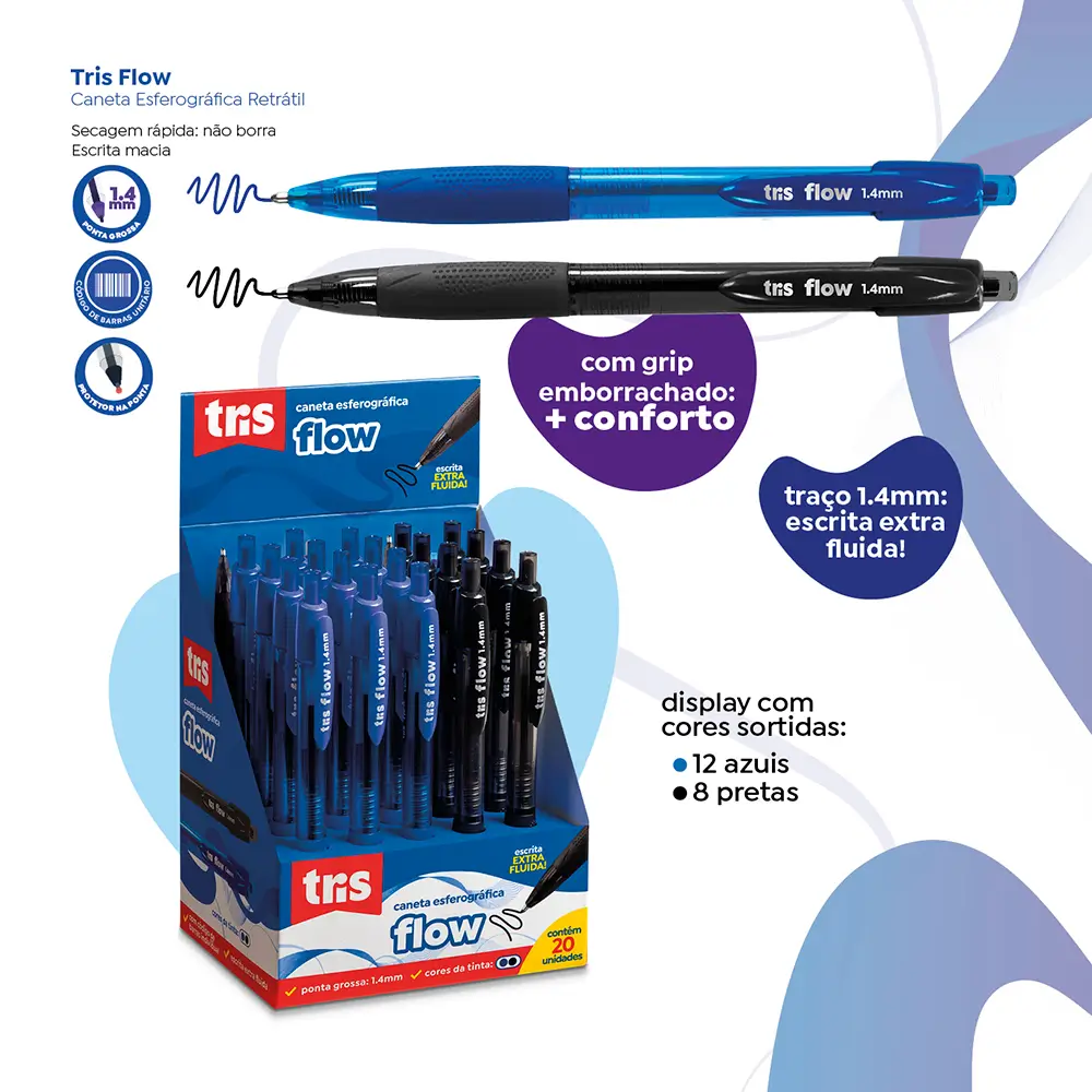 Escrita macia e fluida! A Caneta Esferográfica Flow Tris tem super ponta de 1.4mm para um traço extra fluido e mais confortável. Perfeita para quem busca leveza e estilo ao escrever!