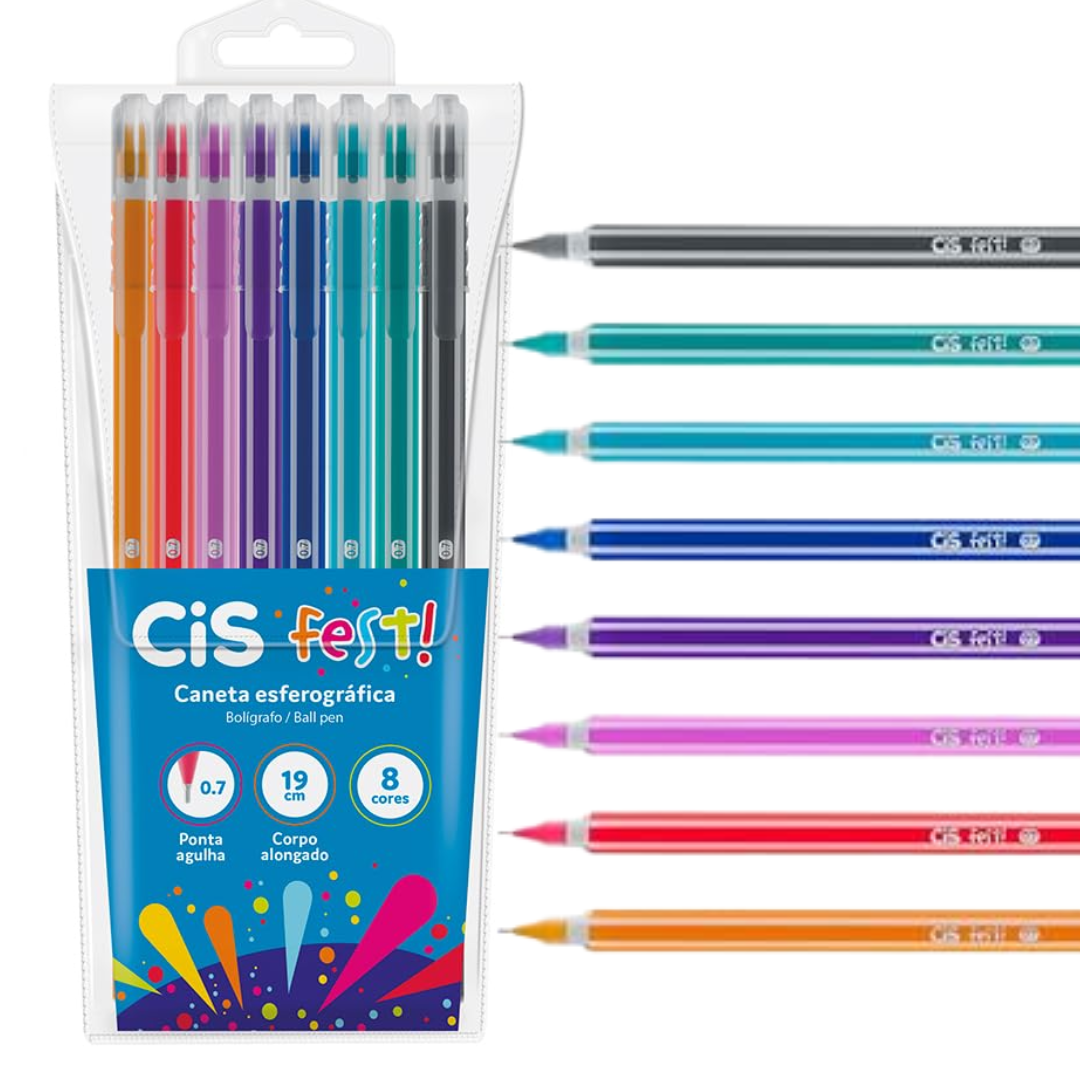 Caneta esferográfica com ponta 0.7mm, corpo plástico da cor da tinta e 19cm de altura.