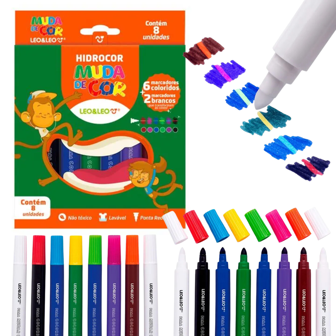 Ele vem com seis marcadores coloridos e mais dois marcadores brancos com o poder de transformar uma cor. É simples: basta usar um marcador colorido e esperar 5s. Depois é só passar o marcador branco sobre a tinta seca colorida para ela mudar de cor. Sua ponta redonda é perfeita para colorir, enquanto o corpo redondo roda com maior facilidade entre os dedos. Aproveite. Você vai presenciar o efeito imediato desta novidade no papel e nas suas vendas.