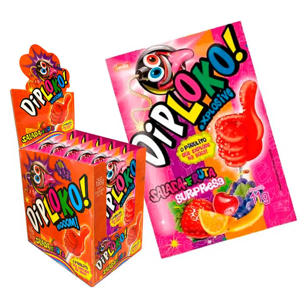 Dip Loko, o pirulito acompanhado de bala explosiva em pó proporcionando uma verdadeira explosão de alegria. Contém 11 unidades de 15g.