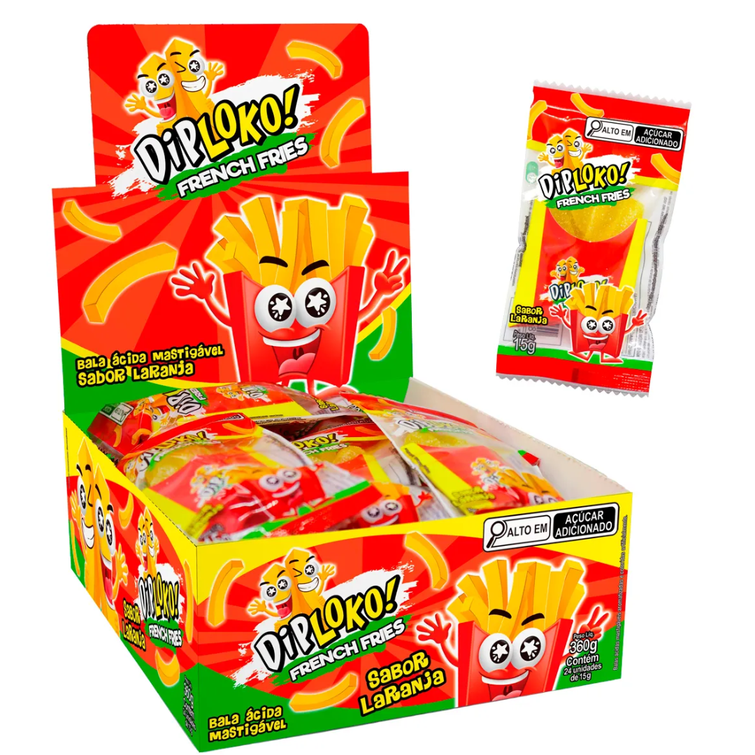 Deliciosas balas ácidas mastigáveis no formata de batata frita sabor laranja. Ideal para colocar nas sacolinhas de doces ou enfeitar a mesa de guloseimas!