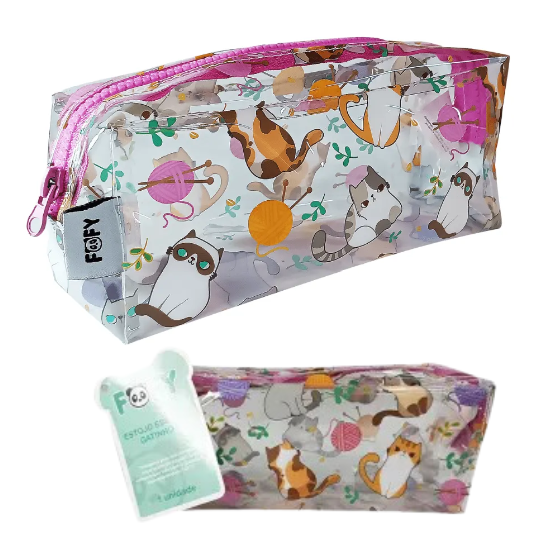 Mantenha seus materiais escolares organizados com muito estilo e praticidade com o Estojo Escolar Gatinhos Fofy! Feito de PVC transparente, ele é resistente e durável, com um zíper maleável que facilita o manuseio no dia a dia. Além de funcional, o design de gatinhos traz um toque de fofura para a sua rotina.