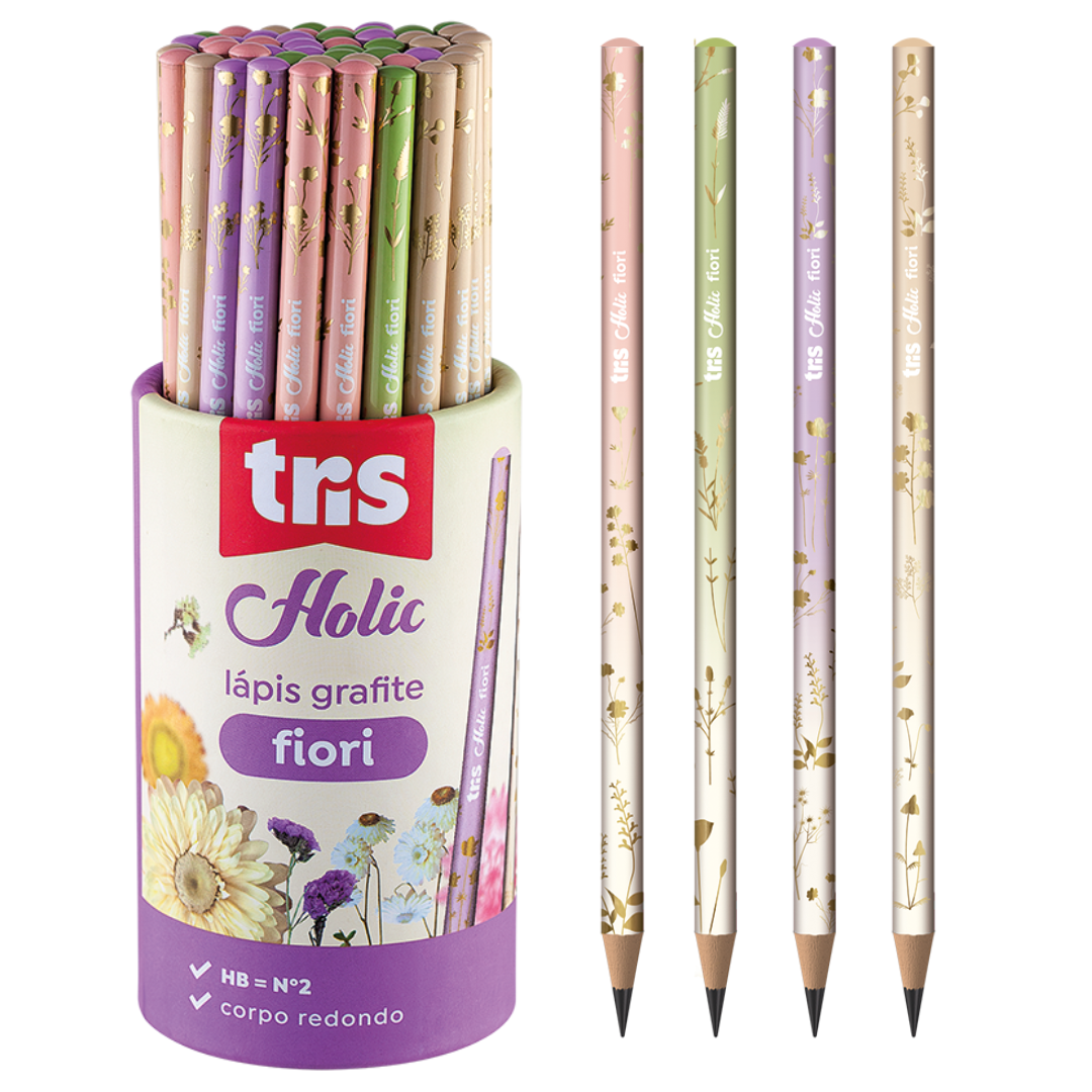 Uma tendência que nunca sai de moda, o floral está em alta com uma abord agem romântica e poética. O mood Delicata explora cores claras e transpa rência, dedicado à delicadeza e à naturalidade das flores. O lápis grafi te Fiori possui corpo em degradê e estampa floral dourada! São 4 modelos super delicados, corpo em madeira e formato redondo.
