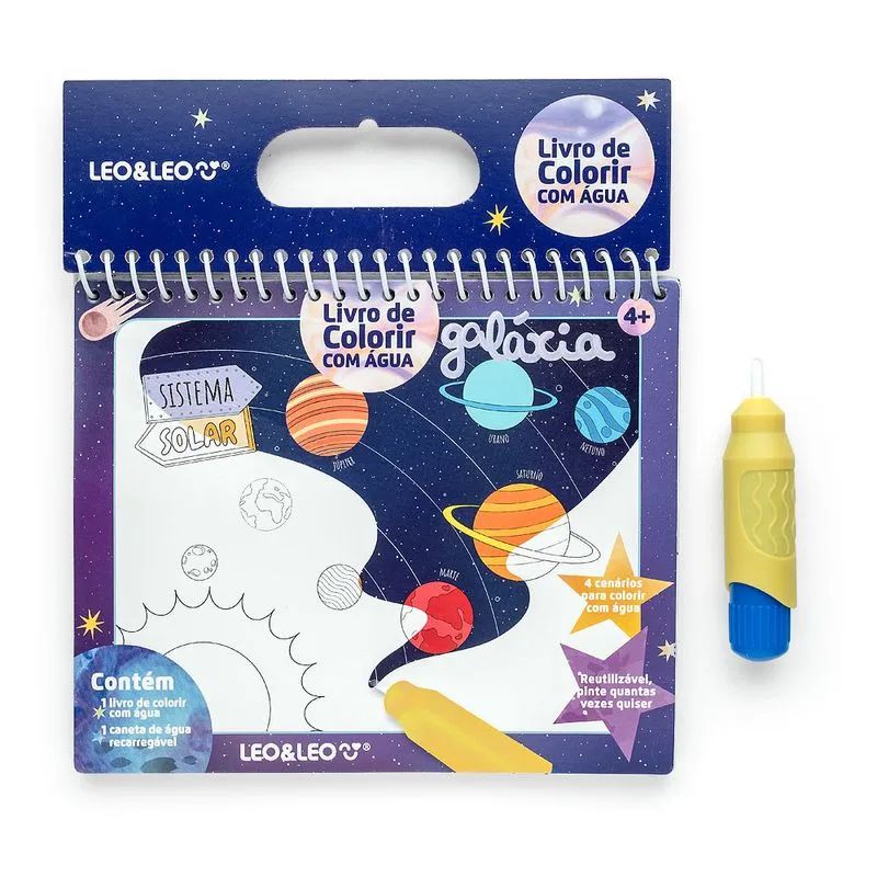 Encadernado em espiral, o livro possui 4 cenas com o tema das galáxias, sistema solar e planetas para colorir com pincel com reservatório de água que acompanha. Saiba como funciona: as cores e imagens ficam escondidas e são reveladas instantaneamente assim que entram em contato com a água. E desaparecem ao secar em alguns minutos, podendo ser usado novamente logo em seguida!