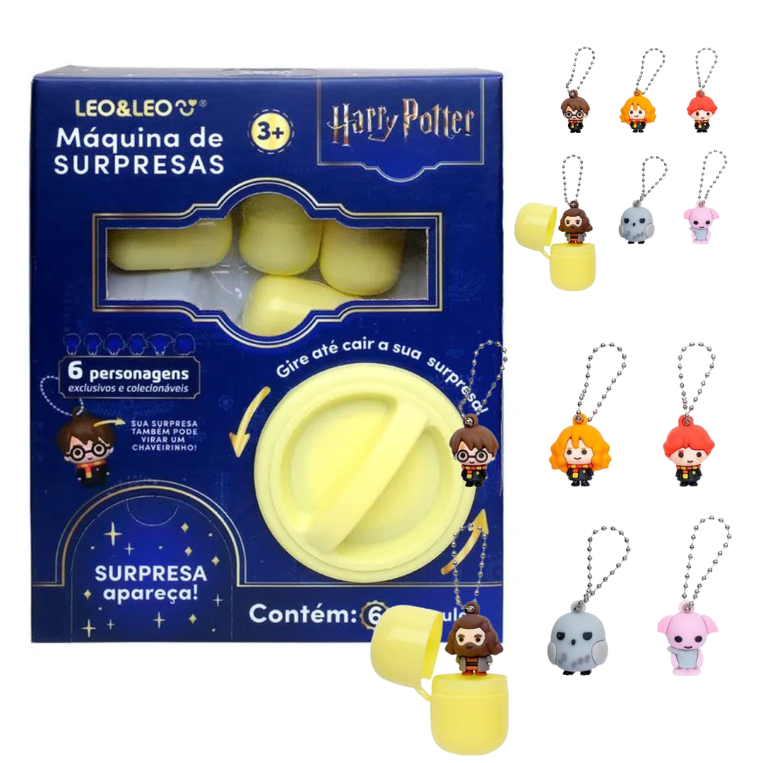 O produto conta com 6 personagens exclusivos e colecionáveis do mundo do bruxinho: Harry Potter, Hermione Granger, Rony Weasley, Dobby, Rúbeo Hagrid e Edwiges. Basta girar o botão da máquina para revelar uma cápsula surpresa. Ao abrir, a criança descobre qual personagem recebeu e pode começar a brincadeira.