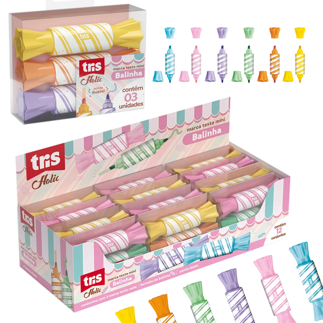 A coleção Docinho traz para as papelarias produtos inspirados nas delícias do universo da confeitaria! Donuts, balinhas, sorvetes e muito mais! É pura fofura! O marca-texto mini Balinha possui ponta dupla e formato de bala, tão fofo que dá vontade de provar! São 2 lindas combinações de 3 marca-textos em conjunto de acetato!