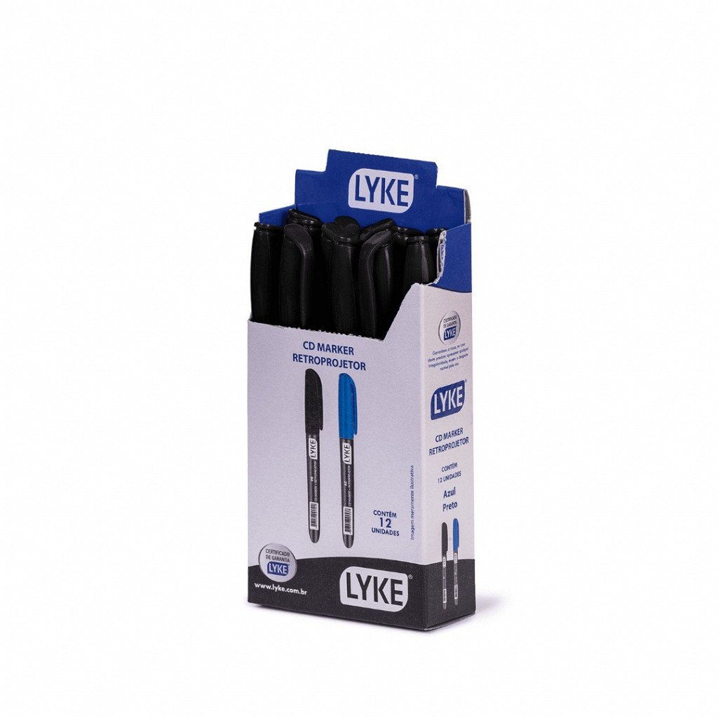 Marcador para CD e Retroprojetor LYKE, na cor preta, ideal ser aplicado em CDs, DVDs, retroprojetores, plásticos, vinis, vidros, papeis madeiras e metais, podendo ser usado para manter seus objetos nomeados e organizados.