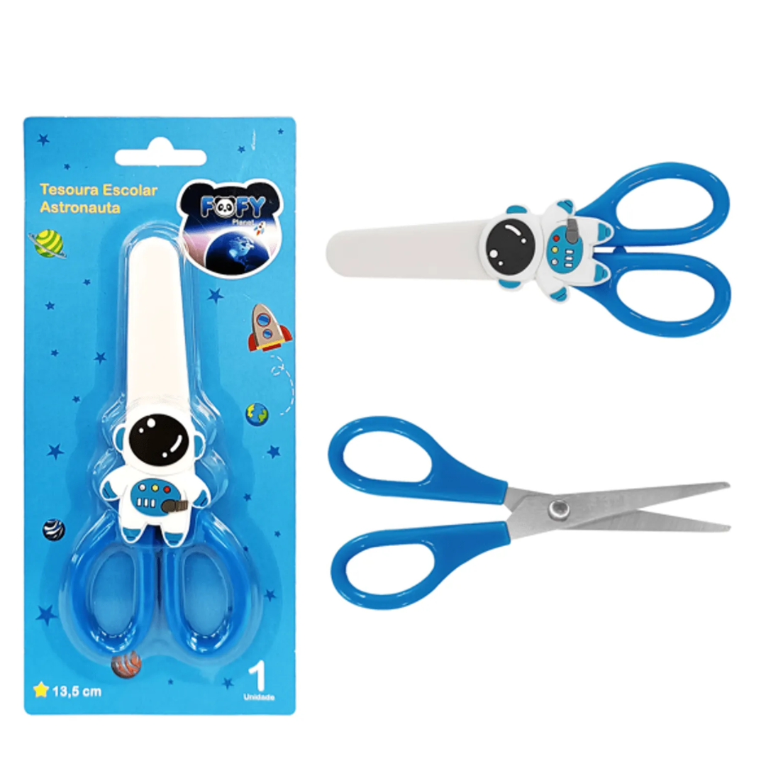 DESCRIÇÃO: Tesoura Escolar Astronauta com suporte super linda da Marca Fofy.