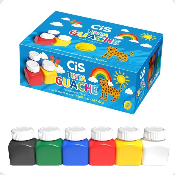 Tinta Guache escolar infantil com 6 cores;